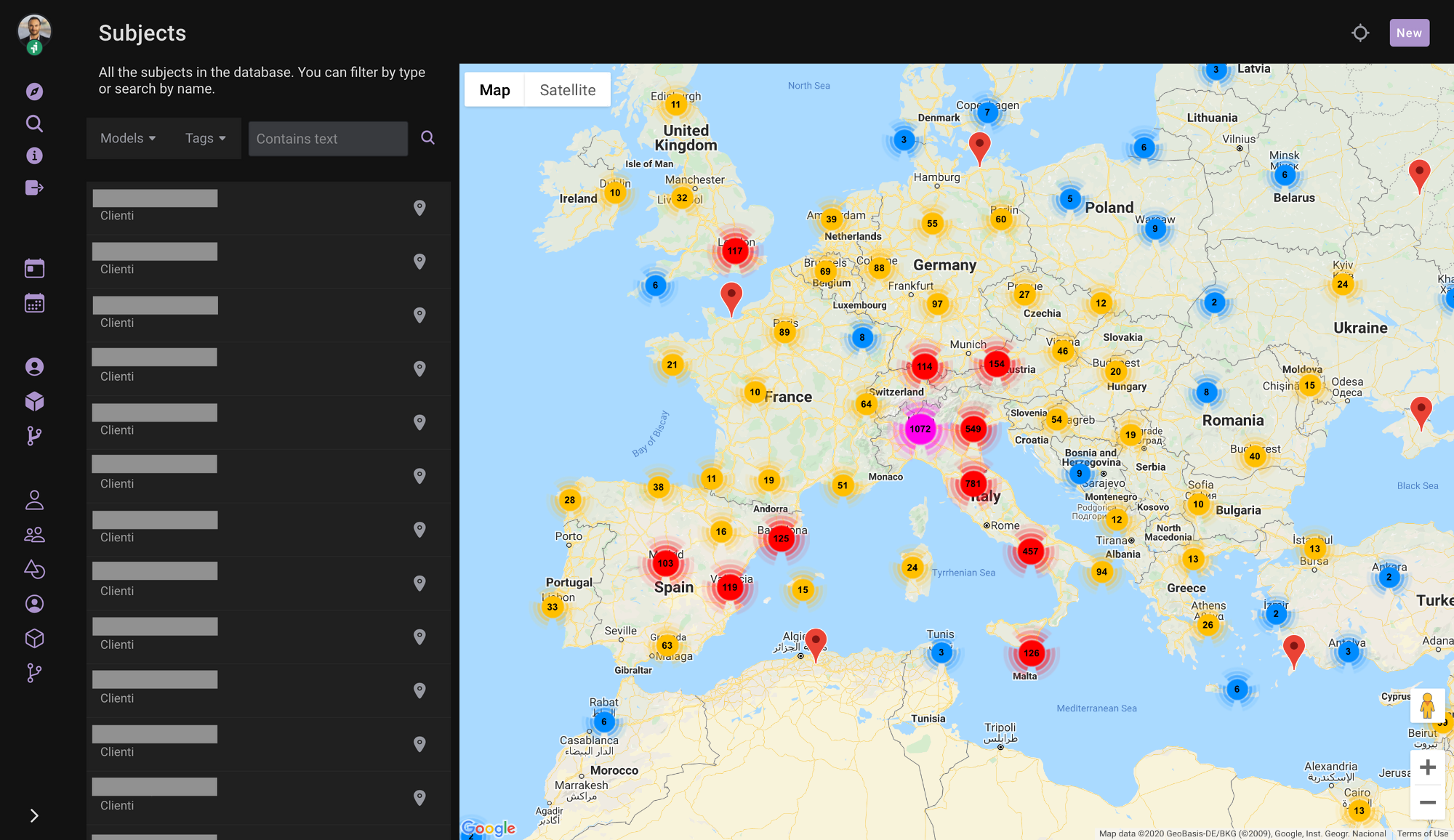 Tutti i tuoi soggetti saranno ora raggruppati in base alla loro posizione geografica (calcolata automaticamente dal loro indirizzo), così che tu possa esplorarli in una mappa, facendo zoom e spostandoti intorno.