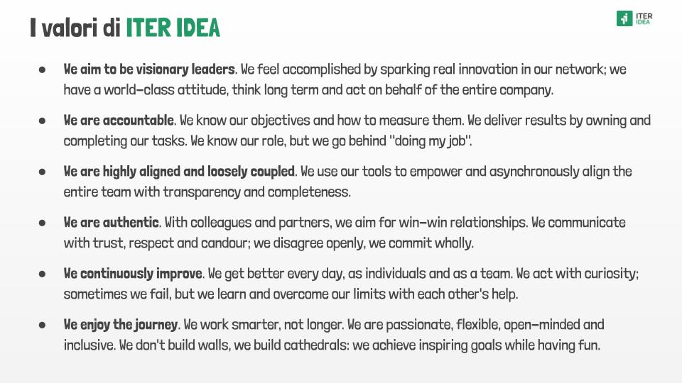 portare a esempio i valori di ITER IDEA come elemento guida verso un ambiente civile e produttivo.