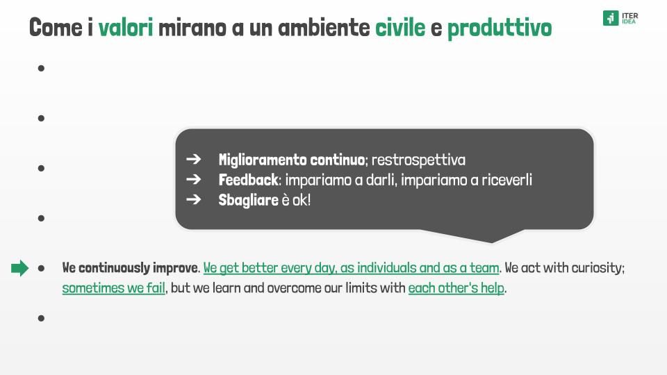 L'inseguimento al miglioramento continuo è parte della filosofia Agile che in ITER IDEA sposiamo nel concreto per assicurare una crescita proficua, come gruppo e come individui, professionale e personale. Prima di questo, è però uno step fondamentale la consolidazione di un ambiente civile (vs ambiente ostile), inteso come ecosistema collaborativo caratterizzato da una comunicazione serena e trasparente, rispetto ed apertura tra individui, mentalità orientata al problem-solving (rispetto al "puntare il dito"), capacità di confronto e discussione produttiva, ecc.