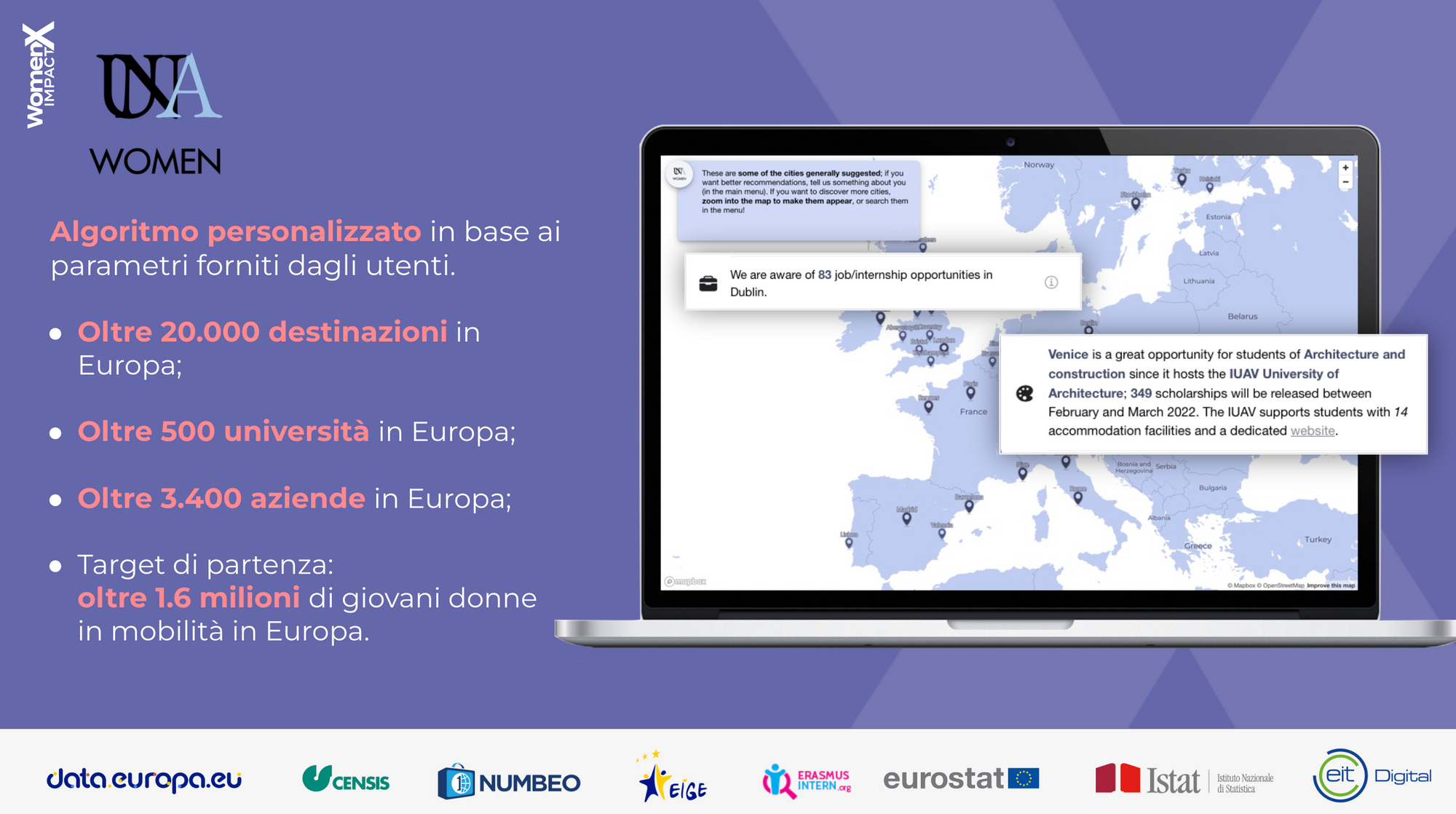 La soluzione supporta utenti ed in particolare giovani donne nella scoperta e l'esplorazione delle opportunità europee più adatte in base alle proprie caratteristiche o desideri professionali e non.
