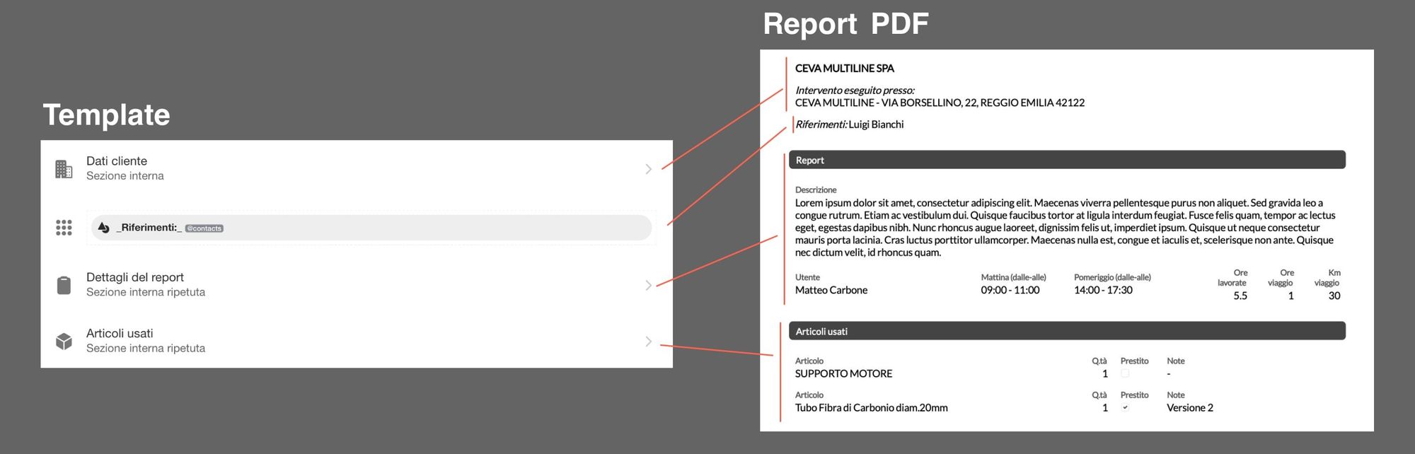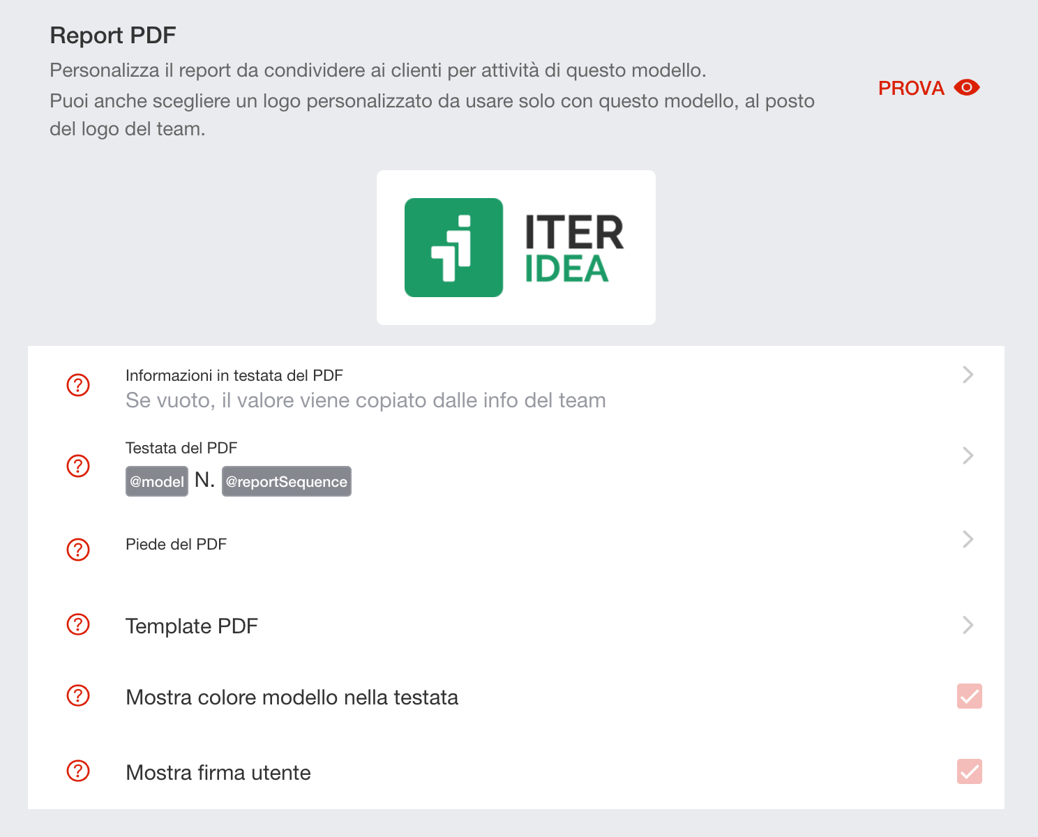 Nella pagina di un Modello, potrai interagire con una nuova sezione: Report PDF.