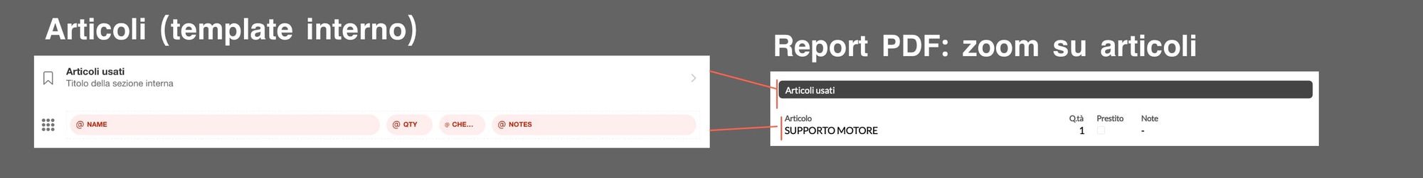 Avvantaggiandoti di diversi tipi di sezione (dati cliente, dettaglio report, dettaglio utenti, articoli utilizzati, ecc.), potrai andare a fondo con la personalizzazione, decidendo quali campi mostrare su ogni riga e quanto spazio far loro occupare. Puoi vedere un esempio della sezione Articoli e come questa si mostra nel risultato finale.