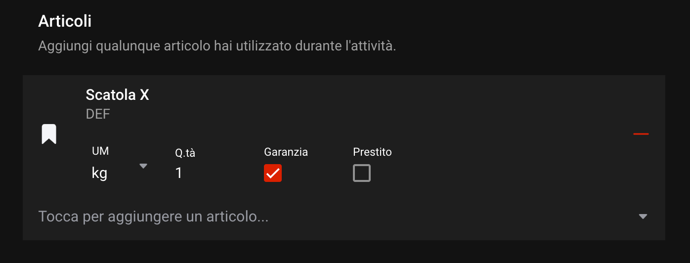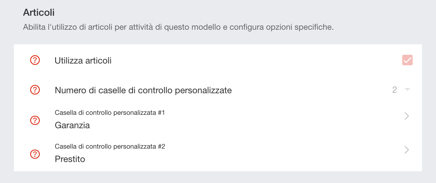 Un'altra funzionalità interessante di questa versione sono le caselle di controllo (checkbox) personalizzate, disponibili quando utilizzi un articolo in un'attività. Scenari tipici sono: articoli che vuoi evidenziare come in prestito, in garanzia, usati, ecc. Come sempre, decidi tu!