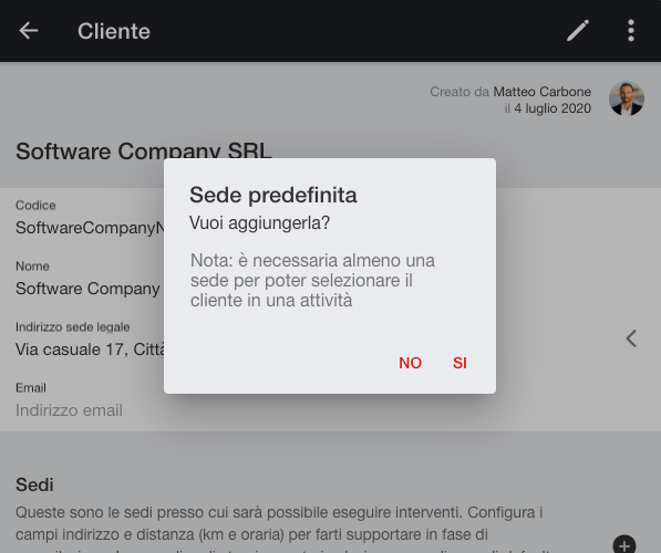 Allo stesso modo, quando crei un cliente, ti proporremo di aggiungere automaticamente una sede predefinita, salvando altri secondi preziosi.