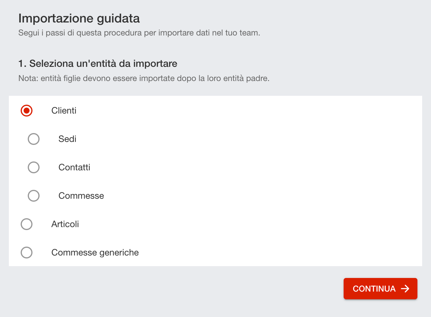 Quando inizi ad utilizzare Scarlett per la prima volta, sono presenti alcune entità demo create con lo scopo di guidarti nei primi passi. Ma, ovviamente, Scarlett non sarà al suo massimo potenziale fino a quando non avrai caricato i dati del tuo team. Per questo, abbiamo progettato due nuove procedure guidate: Import & Export; le troverai nel menu principale.