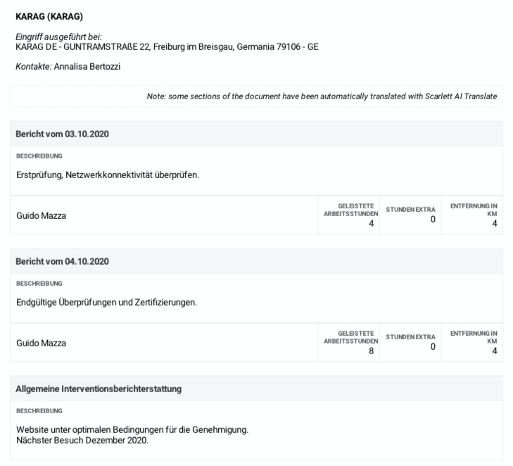 Il miglioramento non si ferma qui: il team è pronto a testare le potenzialità della piattaforma volte a migliorare il livello di servizio offerto ai propri partner internazionali nonché la qualità del lavoro degli utenti all’estero. La nuova funzionalità Scarlett AI Translate consentirà di ottenere traduzioni precise e arricchite tramite dizionari tecnici specializzati, disponibili in oltre 50 lingue; tutto questo sfruttando le meravigliose opportunità offerte dal cloud, dai più potenti algoritmi di intelligenza artificiale e deep learning. I clienti all'estero potranno godere di un'esperienza innovativa, certificando gli interventi dei tecnici ora disponibili e comprensibili nella propria lingua preferita.