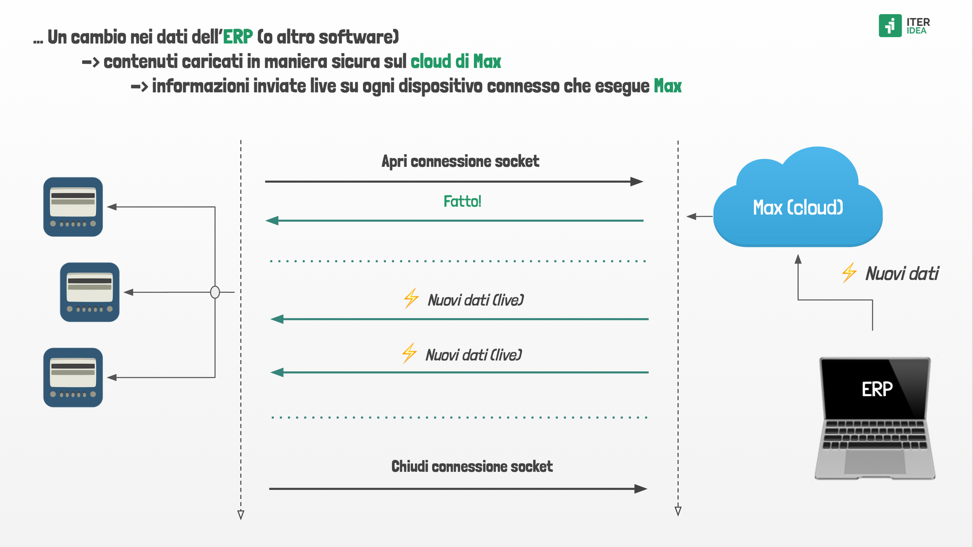 Nel nuovo modello, quando un dato viene modificato nell'ERP (o altro software) e inviato al cloud di Max, le informazioni generate vengono automaticamente distribuite, in tempo reale, a qualsiasi dispositivo che esegue l'app, attraverso una connessione socket sicura.